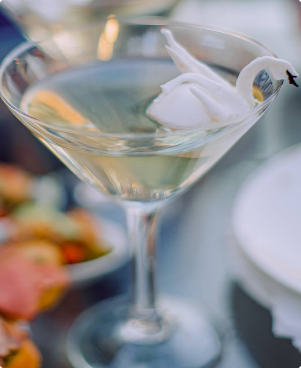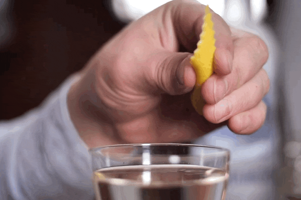 Mix carefully with a bar spoon, then pour the cocktail into martini glasses, keeping the ice away. Finally, add a stripe of citrus zest.