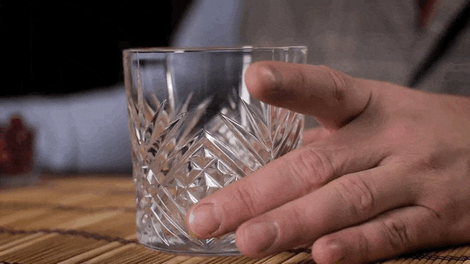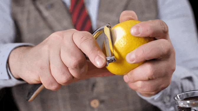 Pour the cocktail into rocks glasses, keeping the ice away. Garnish with some lemon zest pinned to the glass brim.