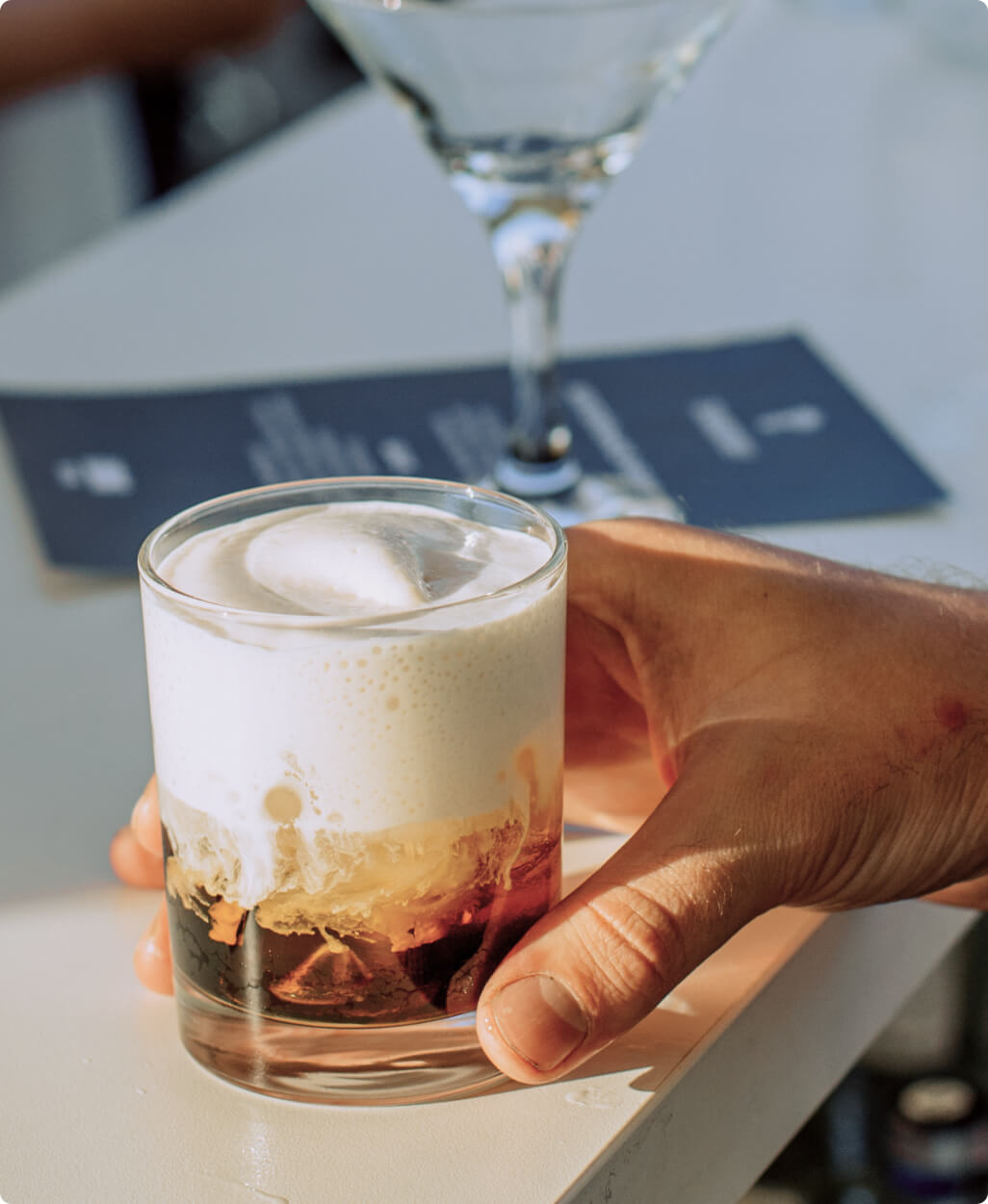 Pour the cocktail into a martini glass, separating the ice. Finally, add a stripe of citrus zest.